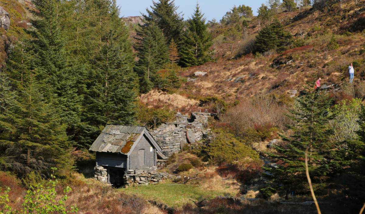 I enden på grusvegen står det ett fint gammelt kvernhus.