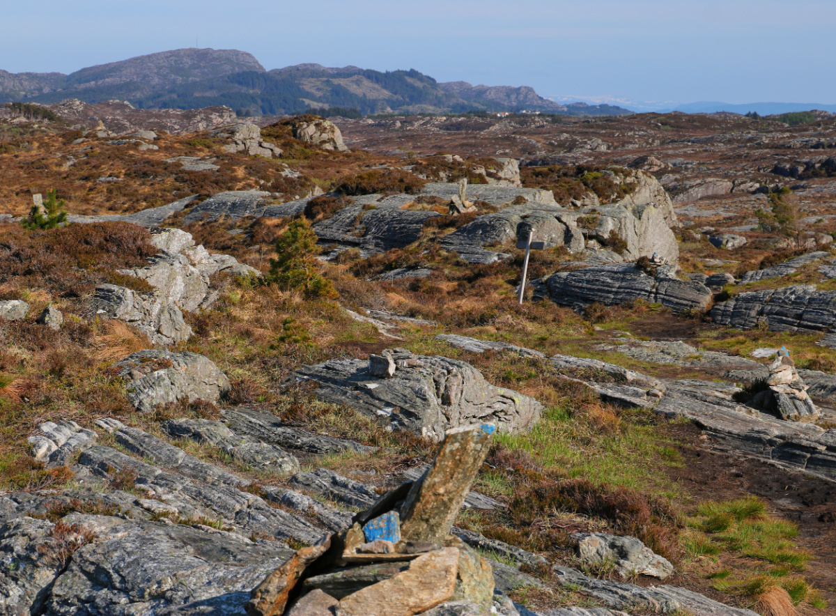 Opp den bittesmå motbakken er det flatt terreng, og ruta er merka med blå steiner.
