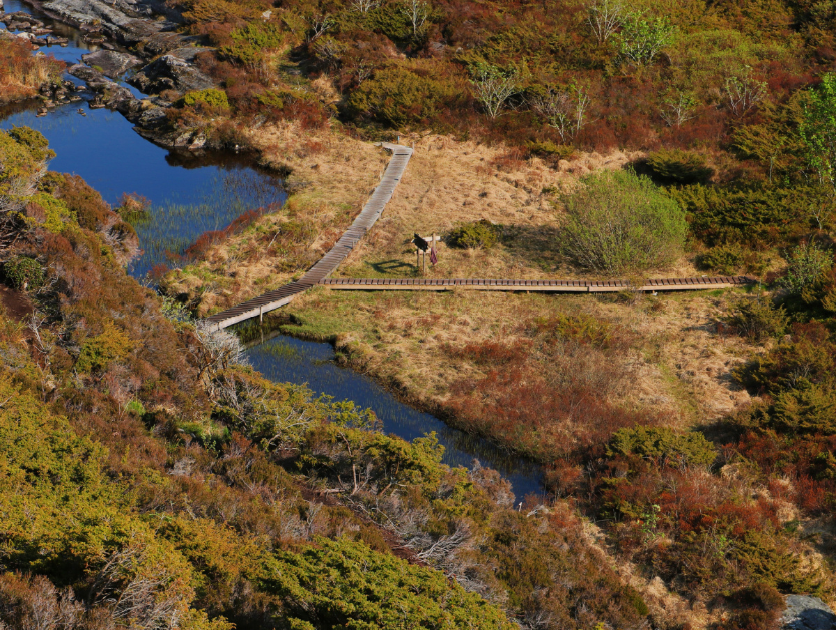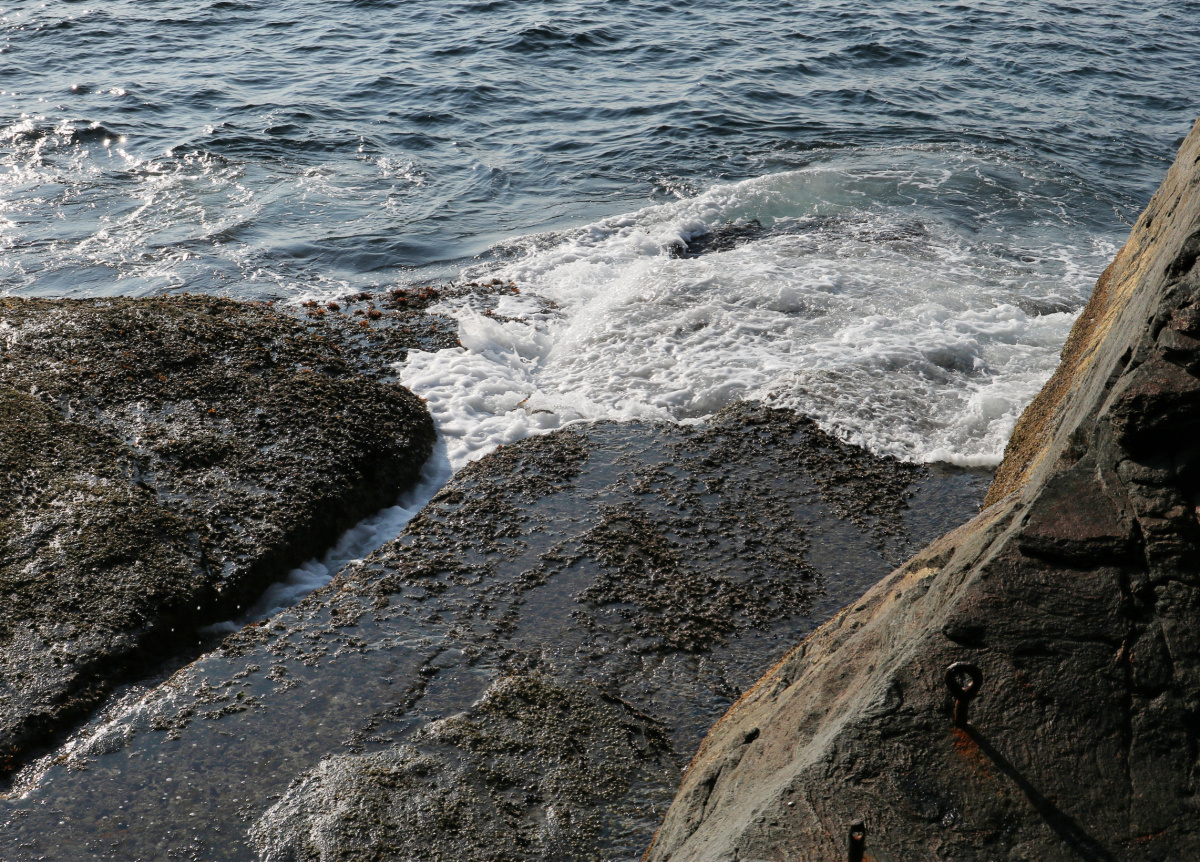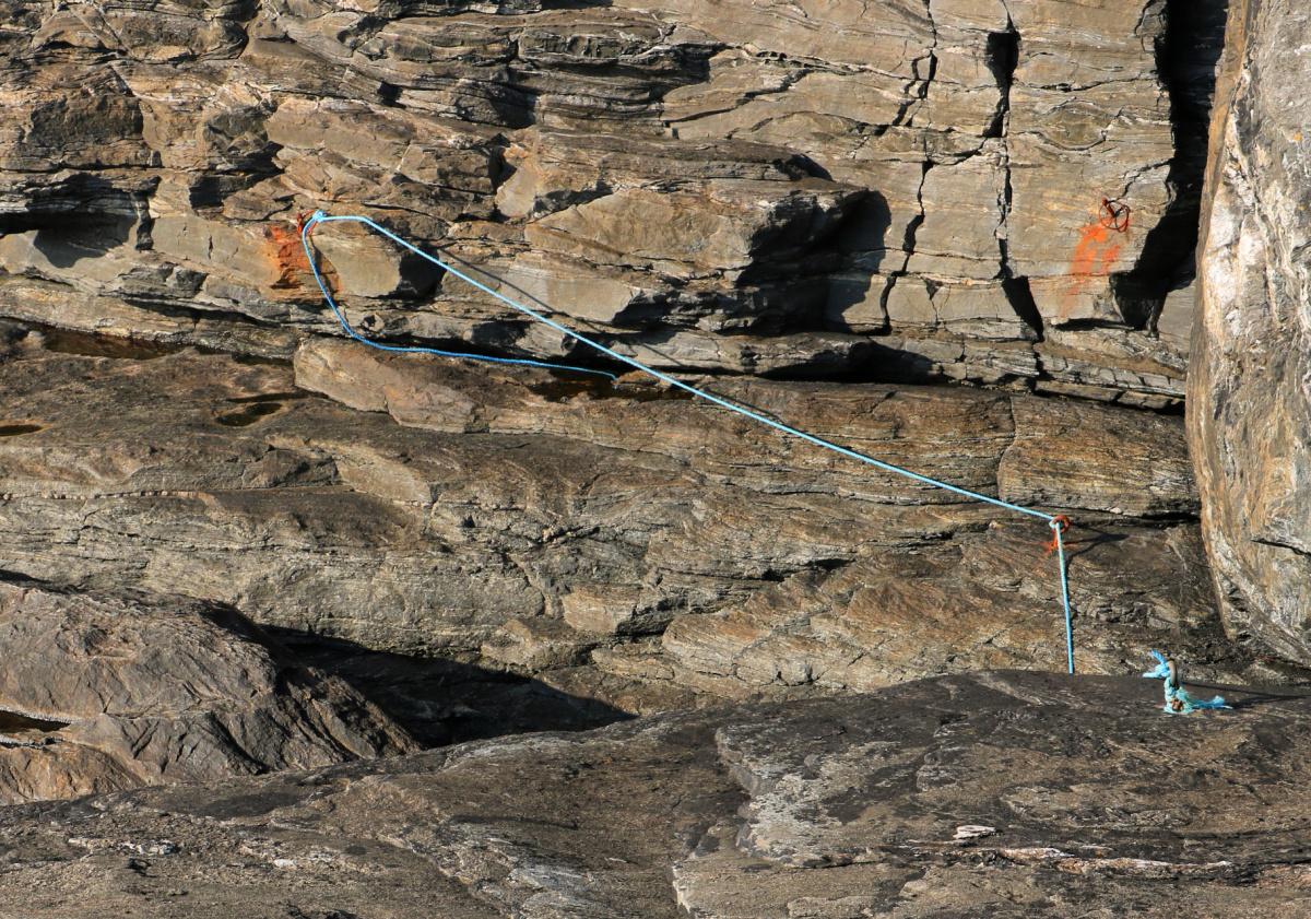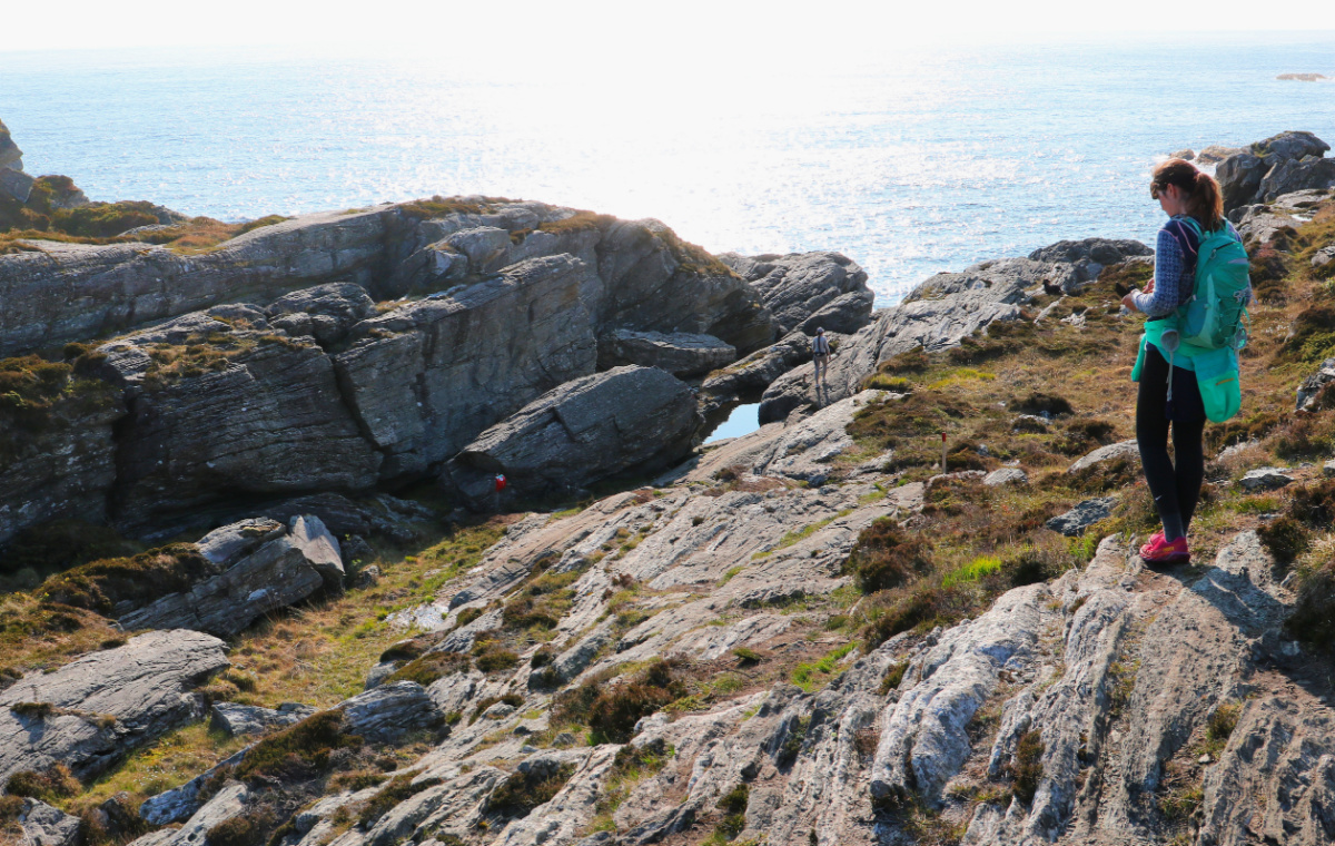 Nedfor boltane er det glatte berget rett til havs, så ikkje tilrådelig å gå her når det er mykje sjø.