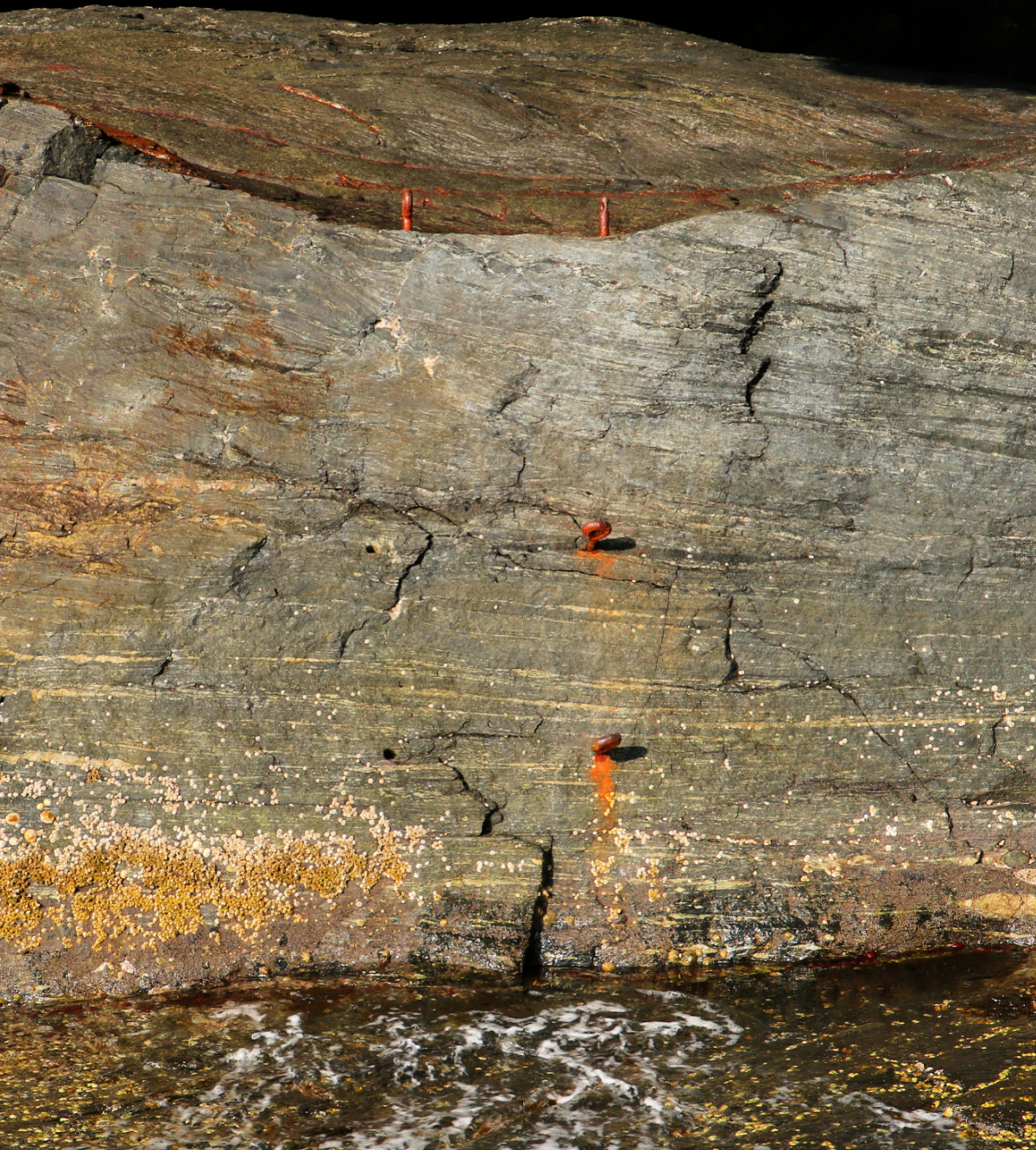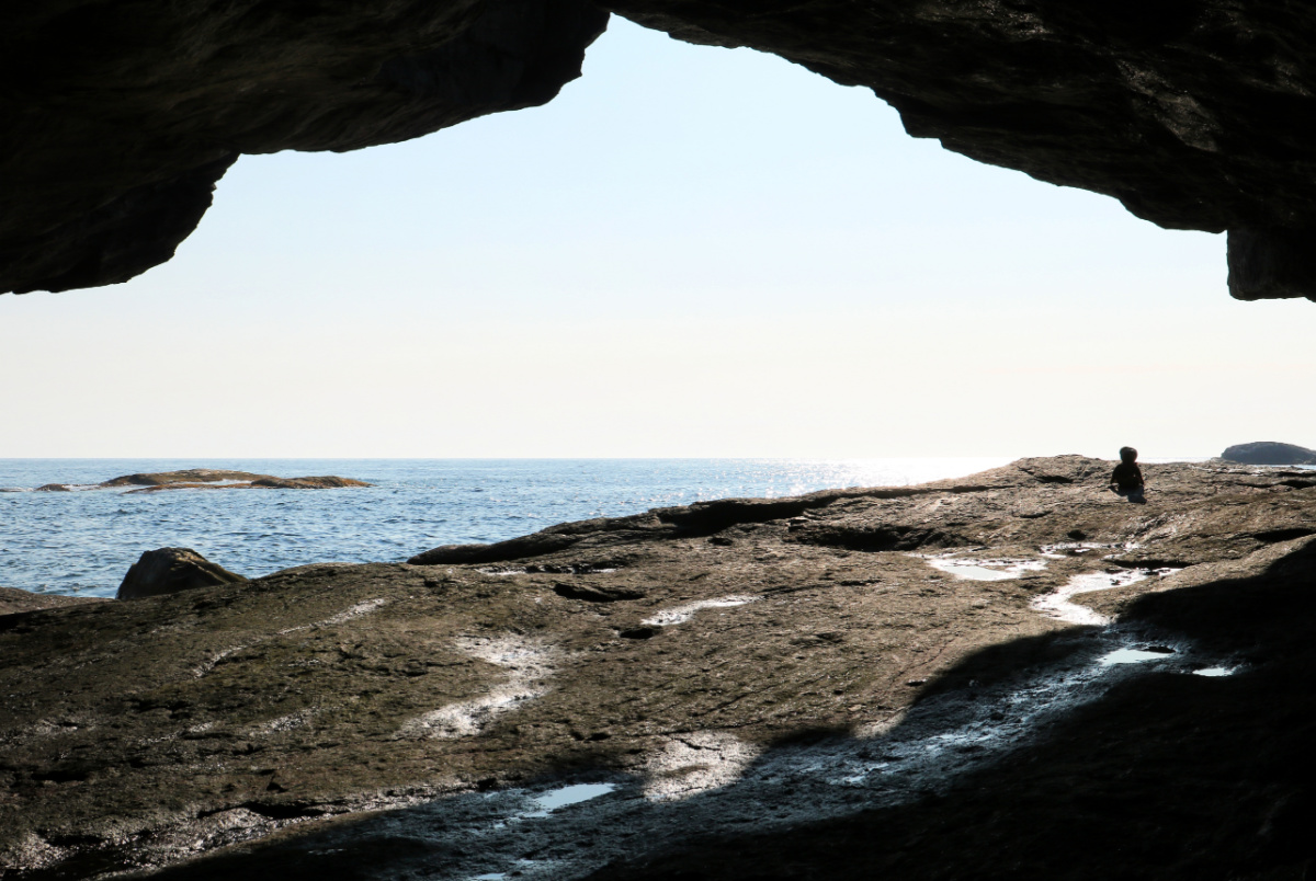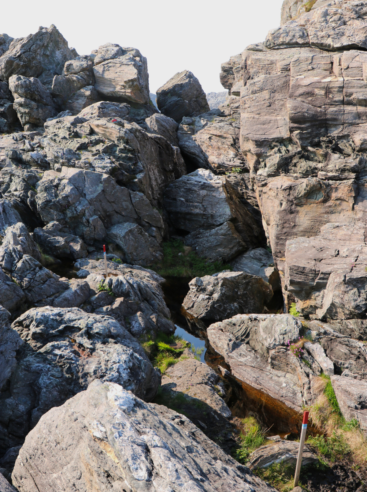 Nedfor boltane er det glatte berget rett til havs, så ikkje tilrådelig å gå her når det er mykje sjø.