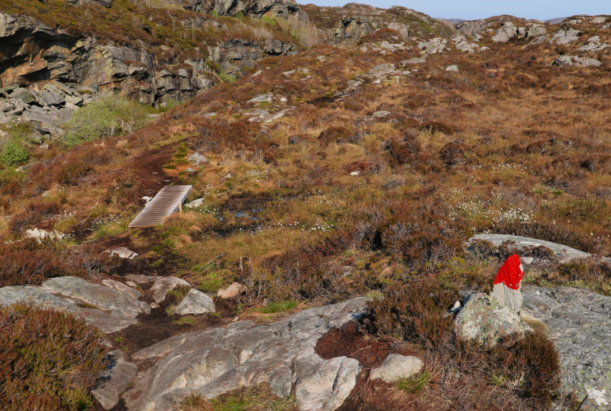 Frå vegkrysset er det å følge røde steiner videre.
