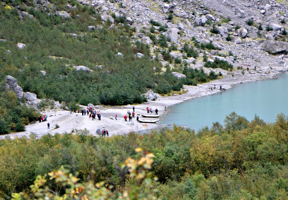 Ved ett vatn rett under Briksdalsbreen har dei båter slik at turistane kan få putre litt nærmere breen.