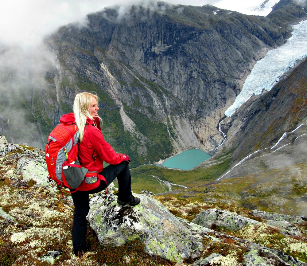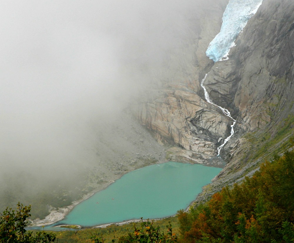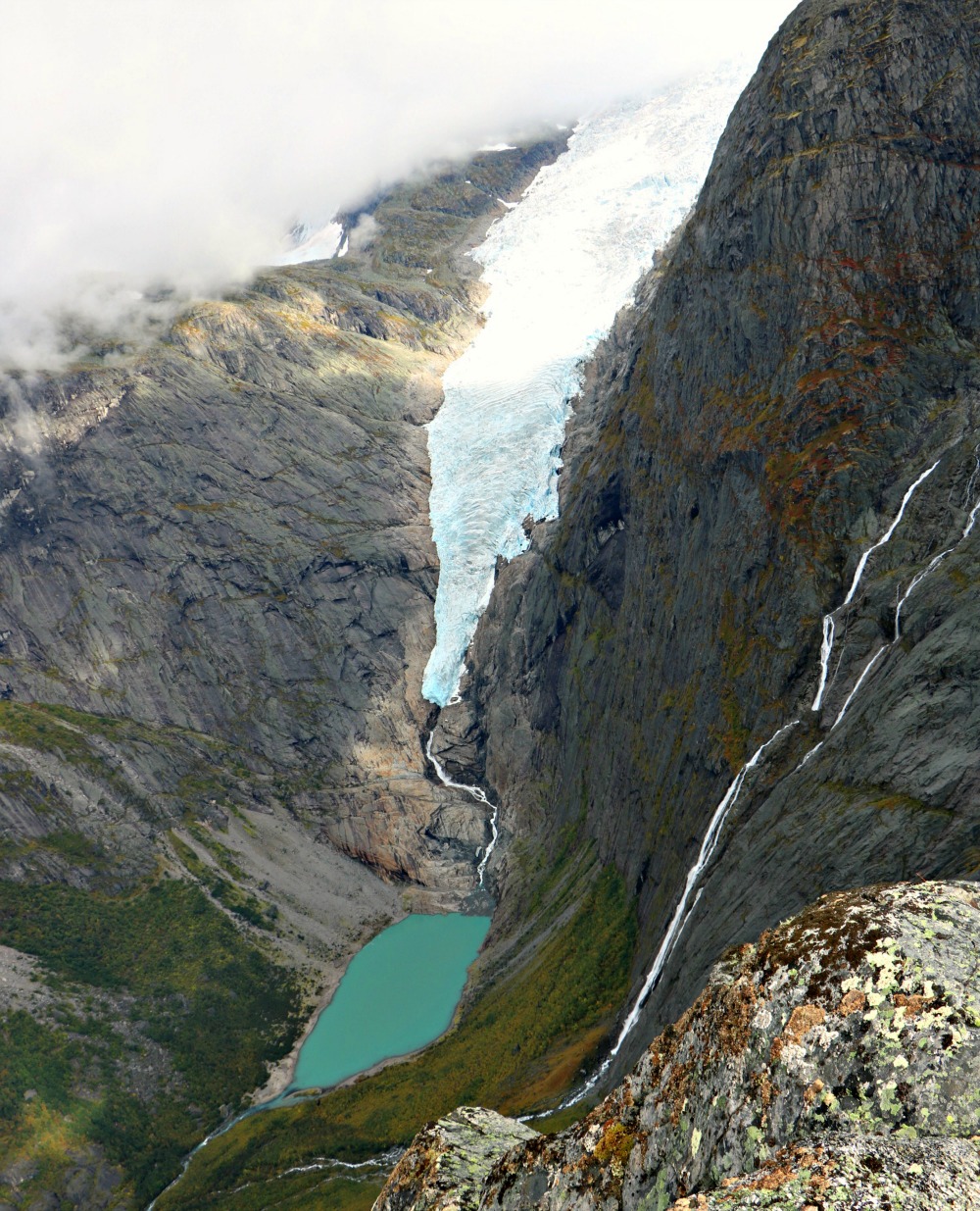 Eg blir aldri lei av å kikke ned på Briksdalsbreen og vatnet der nede.