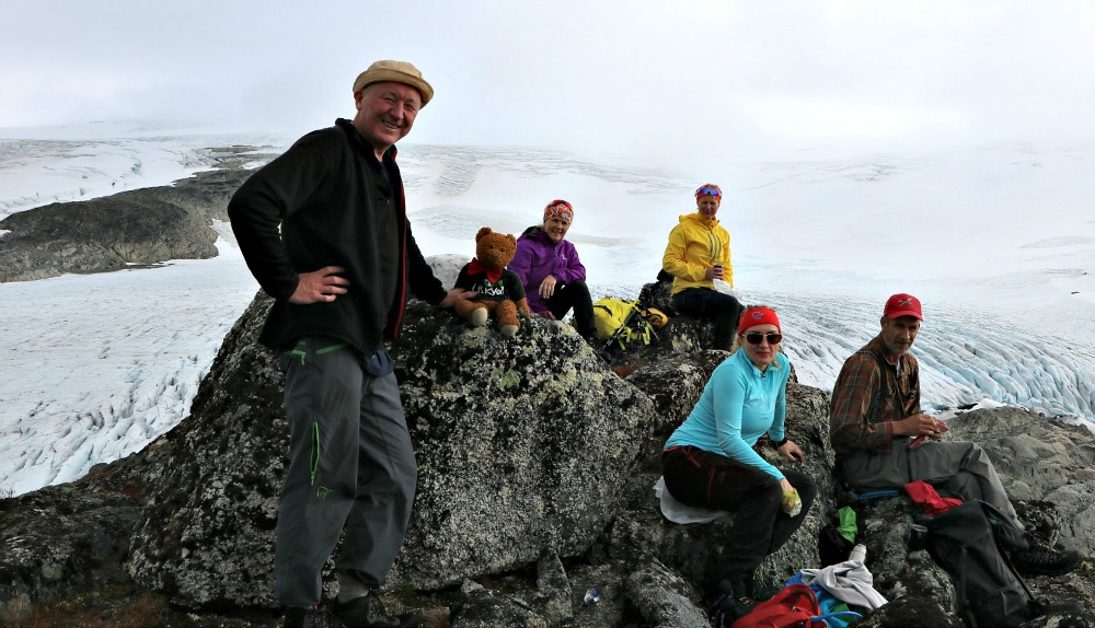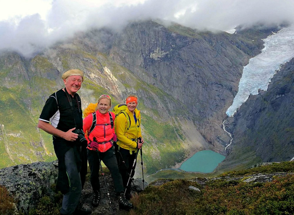 Fornøgde medlemmer av fjellgruppa til HABIL, og Jostedalsbreen i bakgrunnen.