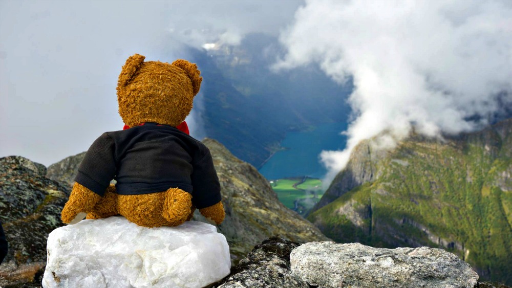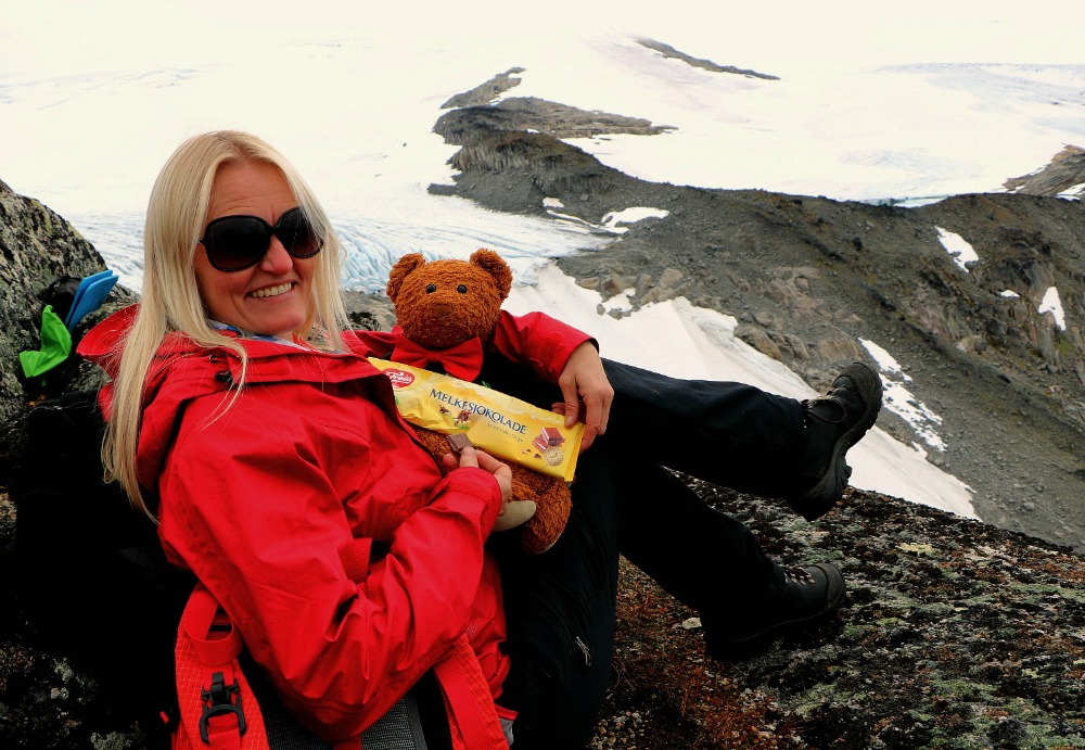 Isbre i bakgrunnen, blondine, melkesjokolade og kosebamse i framgrunnen.