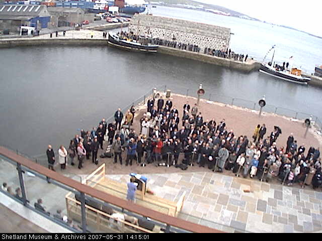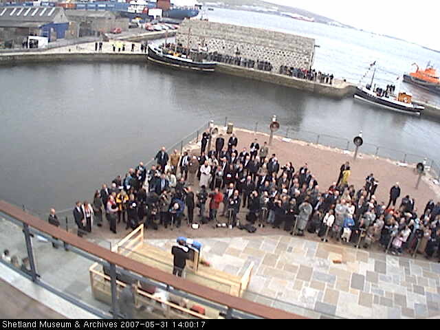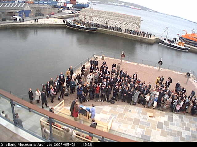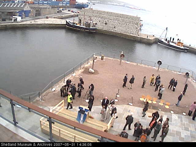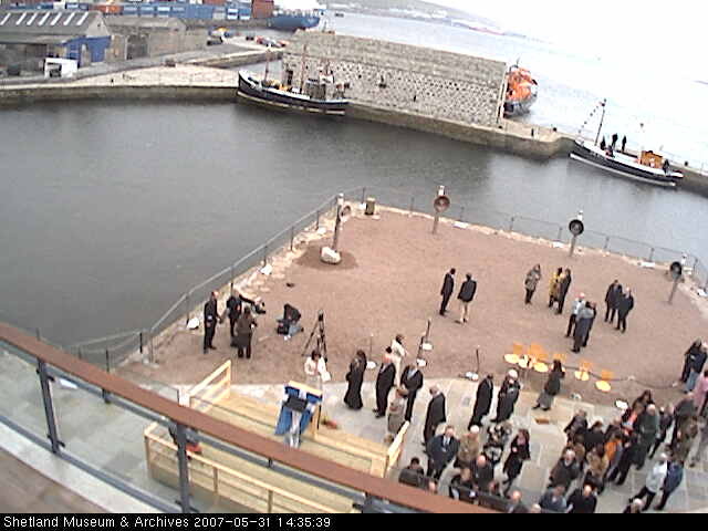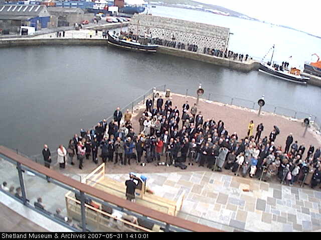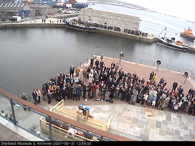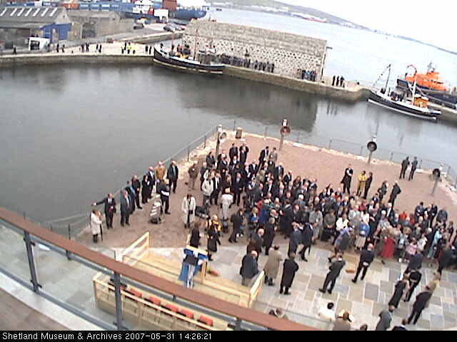 31.Mai 2007 kl. 14:00 åpna Shetland Museum i Lerwick. Shetlenderane har knytte gode band til øysamfunnet vårt,kommunen vår, og for so vidt resten av Noreg. Difor var fleire prominentar frå Noreg invitert. Heimesideskriverske Linda, rådmann Vorland, Fylkesordførar Sandal og Dronning Sonja representerte oss på ein utmerka måte. Dronning Sonja heldt til og med tale. Gry Leite var ikkje med på sjølve åpninga, men skal være med på festen seinare på kvelden med resten av gjengen. Festen starta i kveld ( 31.05.07) kl. 22:00 norsk tid, og vi satsa på at dei prominente gjestane representera oss like godt på festen som dei gjorde under åpninga. I eit vindauga på Shetland Museum står eit webkamera som den mannlege heimesideskrivaren studerte under sermonien. Han lagra unna intressante bilete itte kvart som dei dukka opp. Her kan ein sjå bilete frå åpningssermonien direkte frå webkamera'et i vindauga. Kvaliteten på slike bilete er ikkje av dei beste, men da er no litt kjekt å sjå på likevel. Heimesideskriverska hadde kamera med og tok fleire fine bilete, so når ho kjem heim kan ein få sjå korleis sermonien tok seg ut frå andre sida. Klikk ein gong på bileta for å få dei større. |