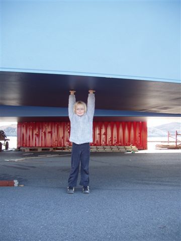Her er Johannes på tur for å kikke på kranskipet som heiser på plass eit bru-kar i Ytre Melværsundet. |