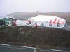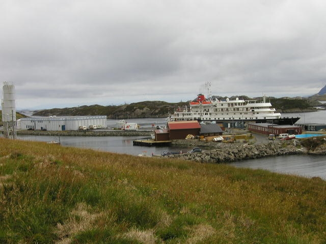 Her ser ein barakkene vegfolket hadde. Til venstre ser ein litt av sementfabrikken. Båt som ligg der er eit Cruise skip med turistar. Foto Ricci Nunez |