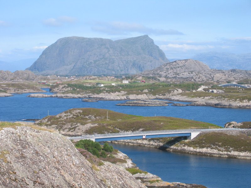 Brua over Ytre Melværsund sett frå ein eller annen topp på Melværen. |