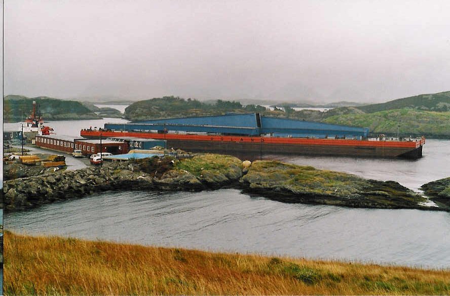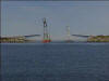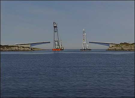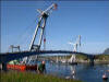 Eit bilete av kranskipa som heng på plass første delene av Olsundbrua. |