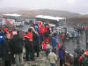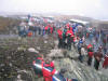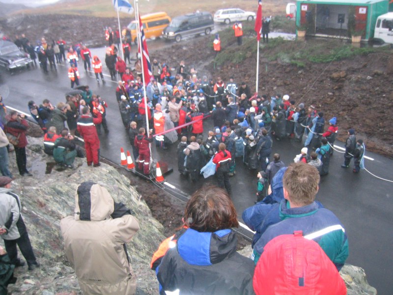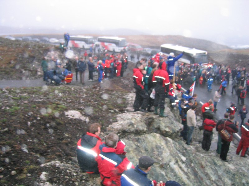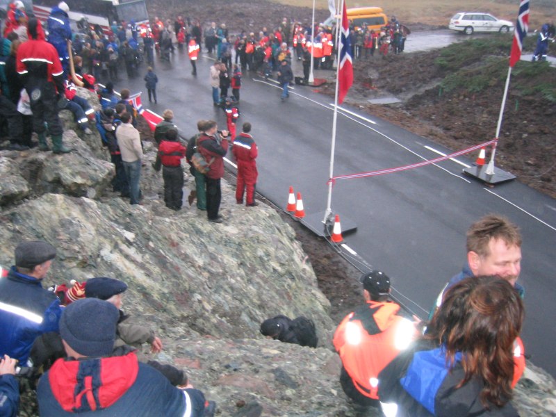 Så heng dei på plass resten. Mange båter er der for å sjå. Ansvarlig frå vegvesenet, Hanekambhaug, lurer og i buskane. |