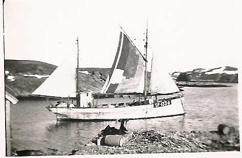 ![]() Bilete frå Nikøyna. Gamlebutikken og båtane "Duen" og "Vega". "Vega" var og over til Shetland med flyktningar under krigen. |