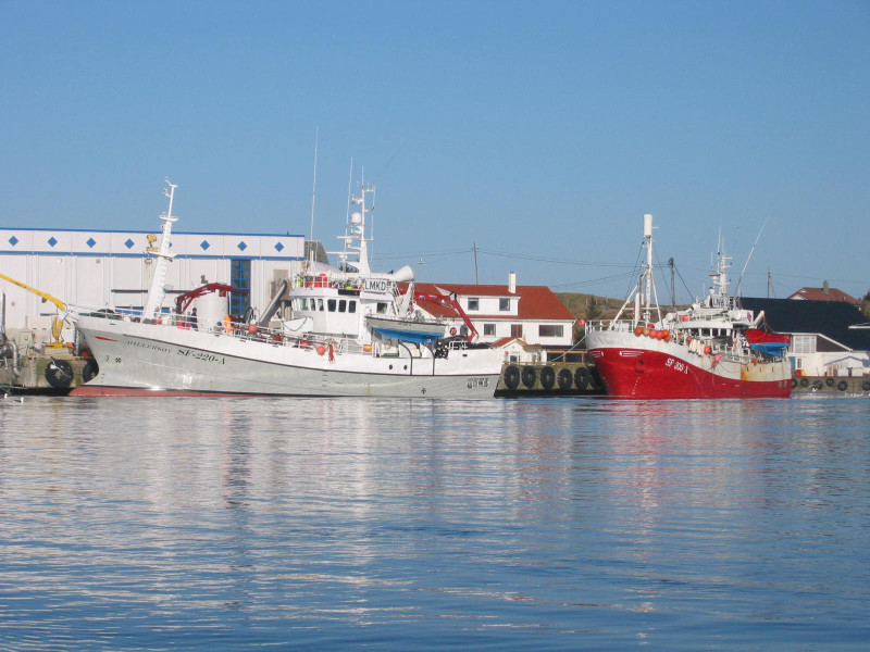 Båtane "Hillersøy" og "Gold Dollar" ligg ved fiskeindustrien og venter på å få levere pale |